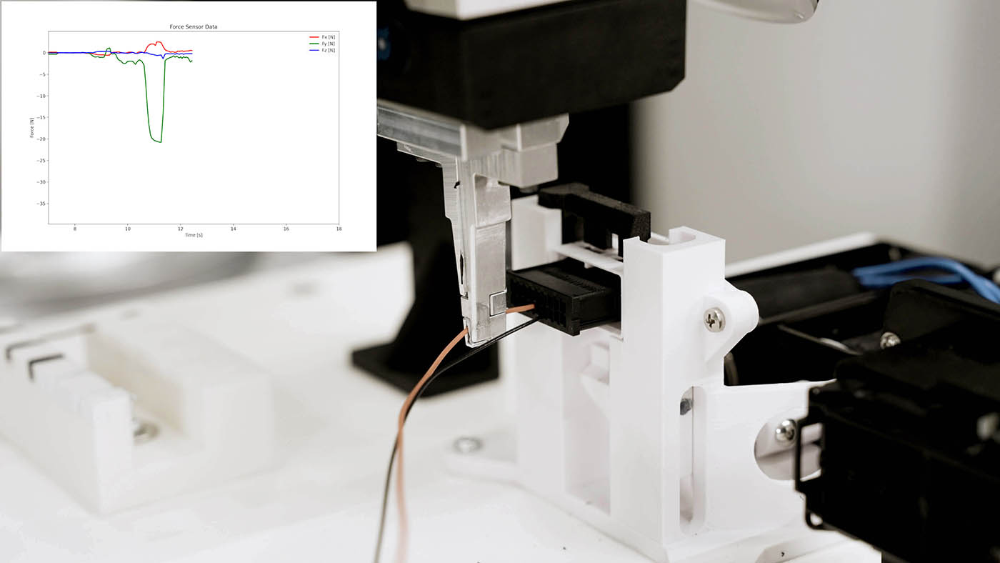 By touching, pressing, or moving the crimp, the robot gathers feedback about the condition of the socket, allowing it to determine the precise placement and orientation of the crimp. This process demands maximum precision - not only to insert the crimps into the housing with sub-millimeter accuracy, but also to prevent any damage during insertion.